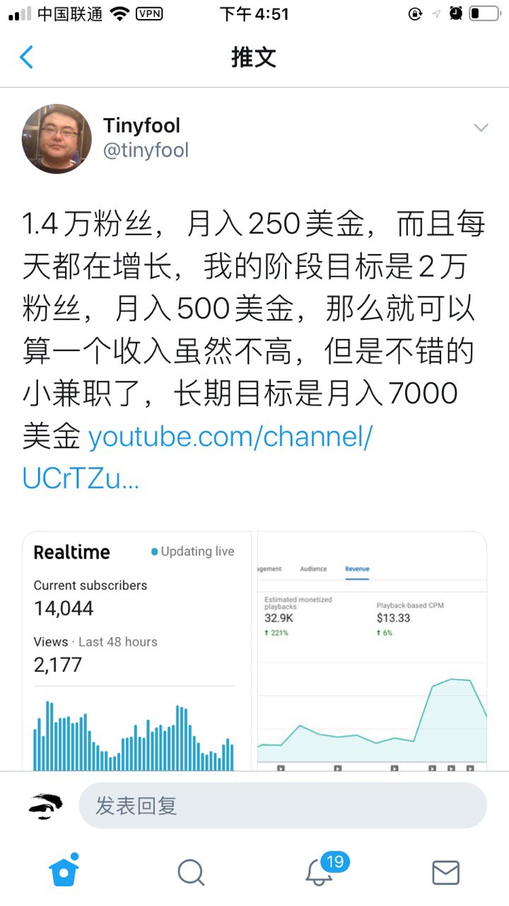 2019年YouTube博主小船公布自己的收入:3个月1万美刀,150万次播放,平均CPM为6.5美元