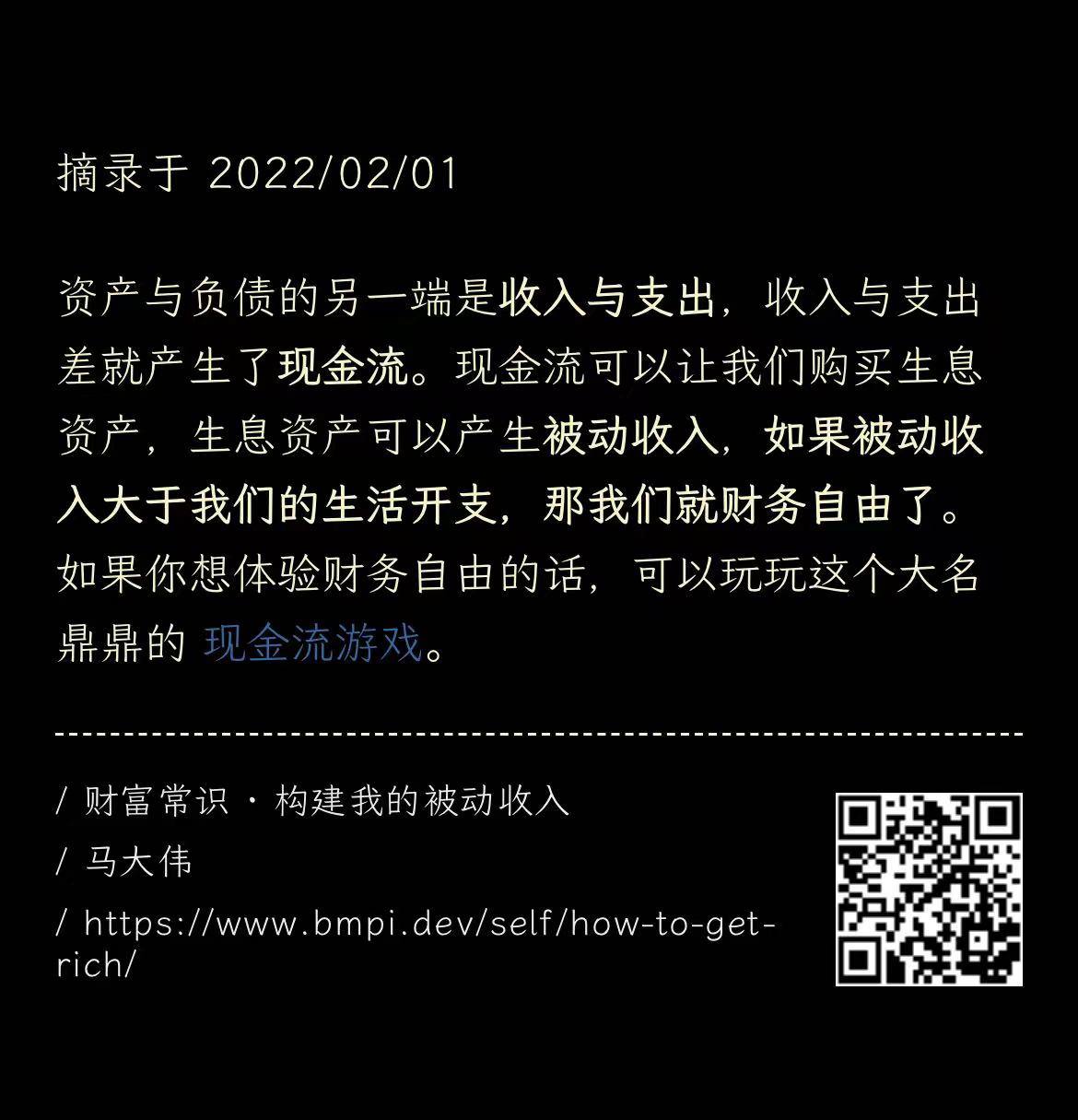 https://tinyletter.com/i365/letters/bmpi-2021-09 本月邮件介绍我的构建被动收入的流程:从学习中获取技能,从技能中获取现金流,现金流通过投资来获取被动收入。