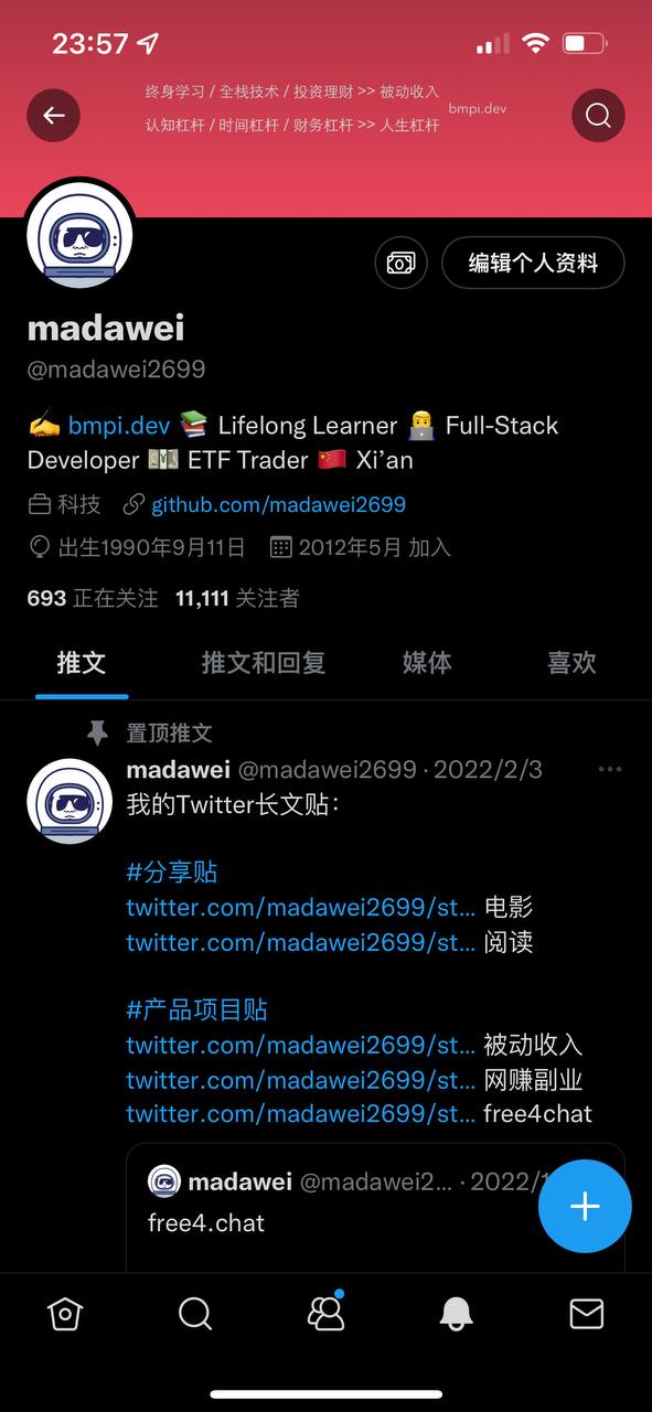 我的Twitter长文贴: #分享贴 https://twitter.com/madawei2699/status/1485649606058803200 电影 https://twitter.com/madawei2699/status/1480053104238153729 阅读 #产品项目贴 https://twitter.com/madawei2699/status/1463383072250892290 被动收入 https://twitter.com/madawei2699/status/1486811962830835712 网赚副业 https://twitter.com/madawei2699/status/1482618090617970696 free4chat https://twitter.com/madawei2699/status/1541215807228637186 开源项目 #学习贴 https://twitter.com/madawei2699/status/1467359935998488577 SEO https://twitter.com/madawei2699/status/1462051768389361670 WebRTC https://twitter.com/madawei2699/status/1454453779718295556 K8S https://twitter.com/madawei2699/status/1451837146097020928 分布式技术 https://twitter.com/madawei2699/status/1479829788139286533 Web3 https://twitter.com/madawei2699/status/1481596368716451842 内容营销 https://twitter.com/madawei2699/status/1532222814576488448 写作那些事 https://twitter.com/madawei2699/status/1552480678381383680 开发实践 #个人相关贴 https://twitter.com/madawei2699/status/1483319468034248708 博客功能 https://twitter.com/madawei2699/status/1476891790280052737 博客数据 https://twitter.com/madawei2699/status/1319494411831529472 投资组合 https://twitter.com/madawei2699/status/1476931598201229312 年度总结 https://twitter.com/madawei2699/status/1398893863683596291 邮件列表 https://twitter.com/madawei2699/status/1408681392729325568 YouTube频道 https://twitter.com/madawei2699/status/1485836657987227648 打工往事 https://twitter.com/madawei2699/status/1485830922427457536 粉丝数据
