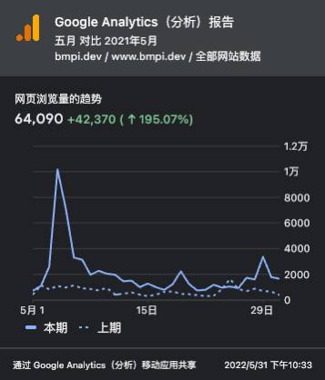 本月博客PV达64K🎉GA的数据因为一些浏览器插件被屏蔽了大概10-20%的流量,按这个计算可能达70-80K,这也和similarweb的数据相吻合了🤔 两年前我还在想这个数字什么时候能到,没想到现在已经实现了,至此已写27万字。我也逐渐开始享受写作的乐趣了👉 https://www.bmpi.dev/self/my-writing-story/250k/