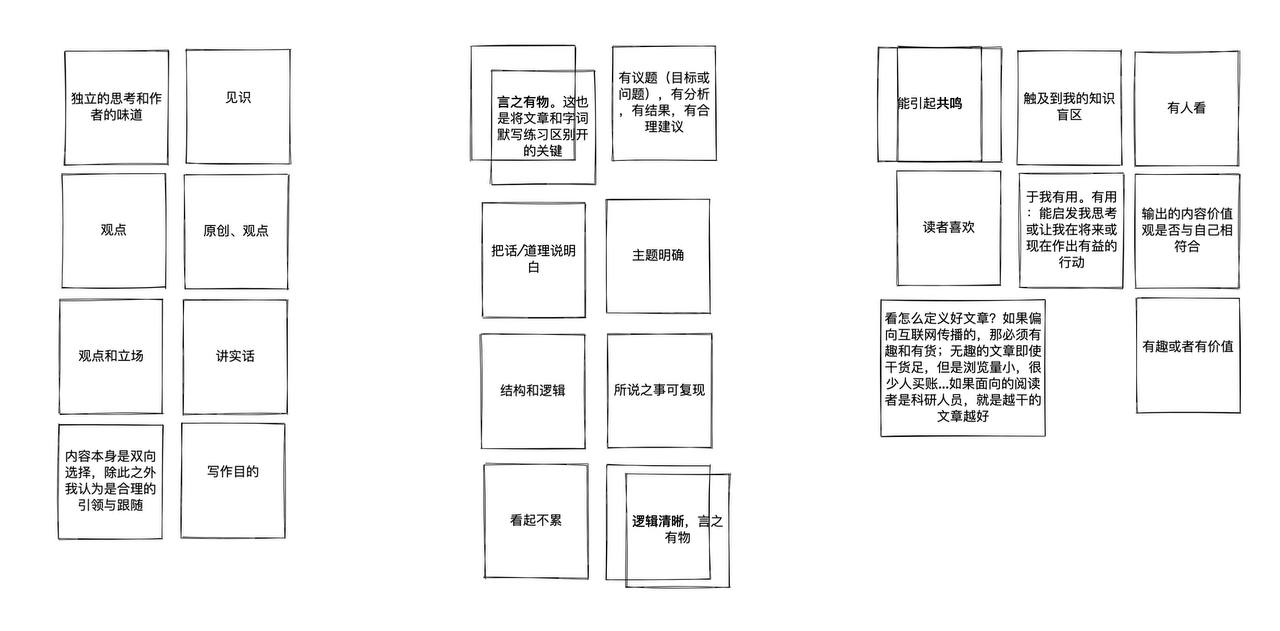 #好文章的要素 在Twitter发了一个讨论:你认为的一篇好文章最重要的一个要素是什么? 收到了一些回复,如图所示,我整理后把这个问题划分为三个视角👇 从作者的角度看: - 有自己的见解、观点和立场 - 写作目的 - 引领读者 - 真诚 从文章的角度看: - 言之有物 - 能把事情解释清楚 - 有结构有逻辑 - 有明确的主题,并能有分析、结果与建议 从读者的角度看: - 引起共鸣 - 引发思考 - 有趣有干货 - 读者喜欢 如果一篇文章能触及以上的一些点,那就是一篇不错的文章,如果在三个视角都能做到一两条,那可能就是一篇优秀的文章。